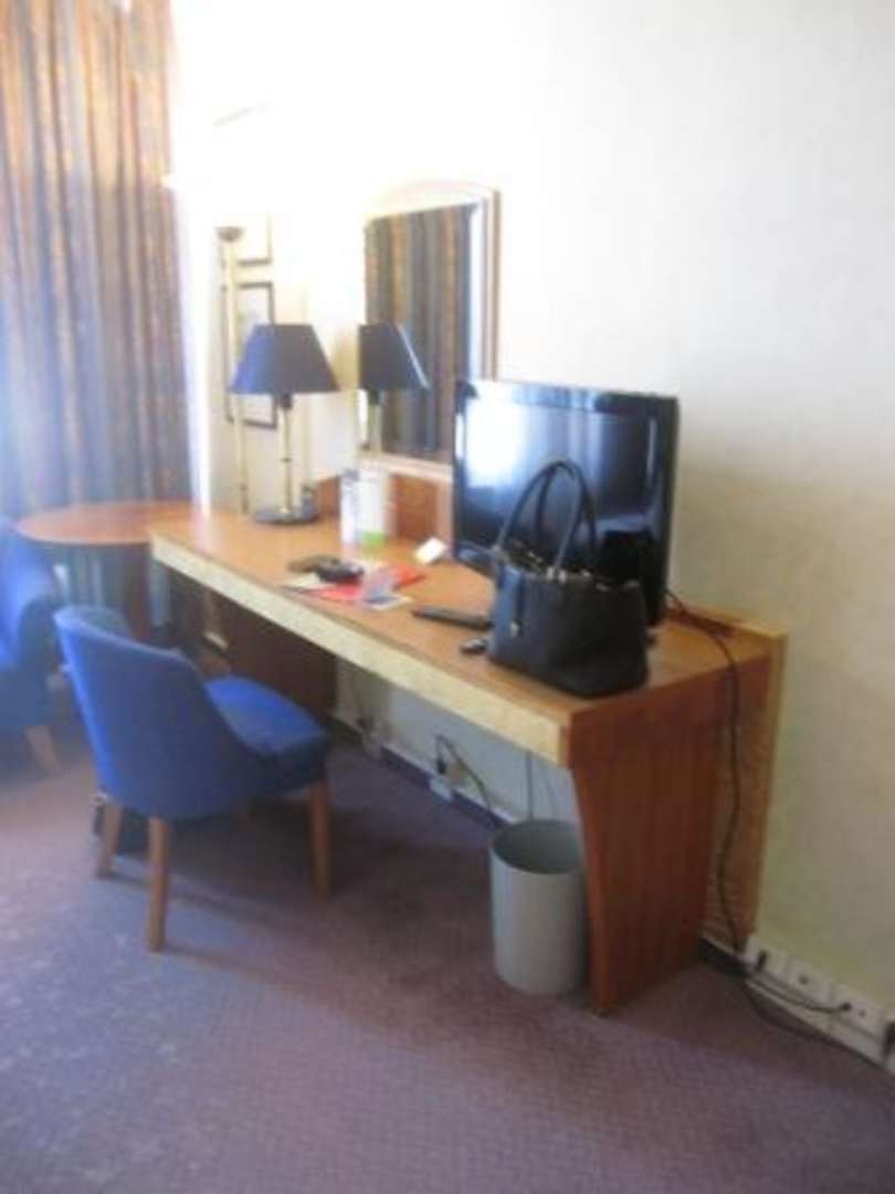 Zwei (unterschiedliche Sessel), Schreibtisch, Flat-TV