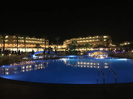 nächtlicher Blick über den Pool aufs Haupthaus