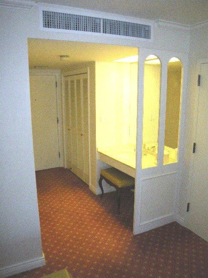 Zimmer 215Blick zur Tür, rechts daneben der Wandschrank, rechts daneben ein zweites Waschbecken außerhalb der Nasszelle