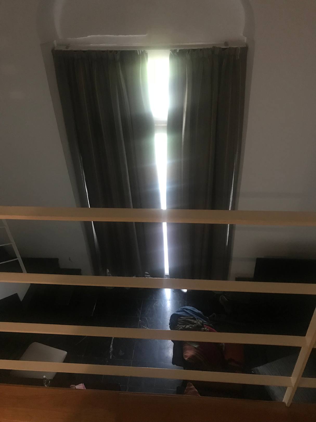 Unten ist eine kleine Küche, Wohnzimmer und Balkon