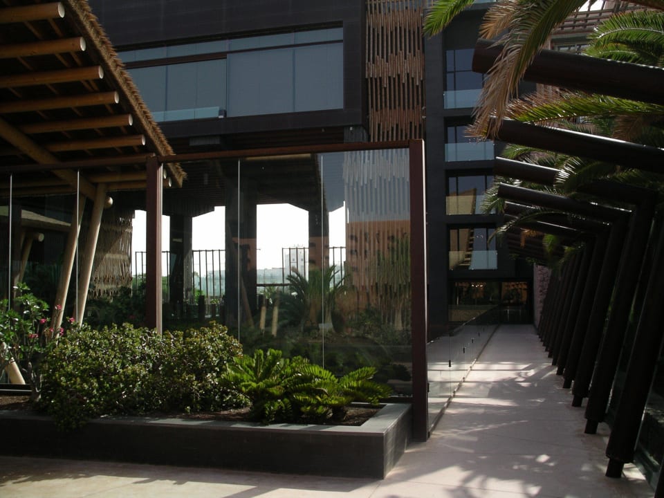 Blick Richtung Haupteingang. Weg führt in Etage 0 zum haupteingang, dem rechten Gebäudeteil mit Zimmern und nach links über einen Steg zur Rezeption.