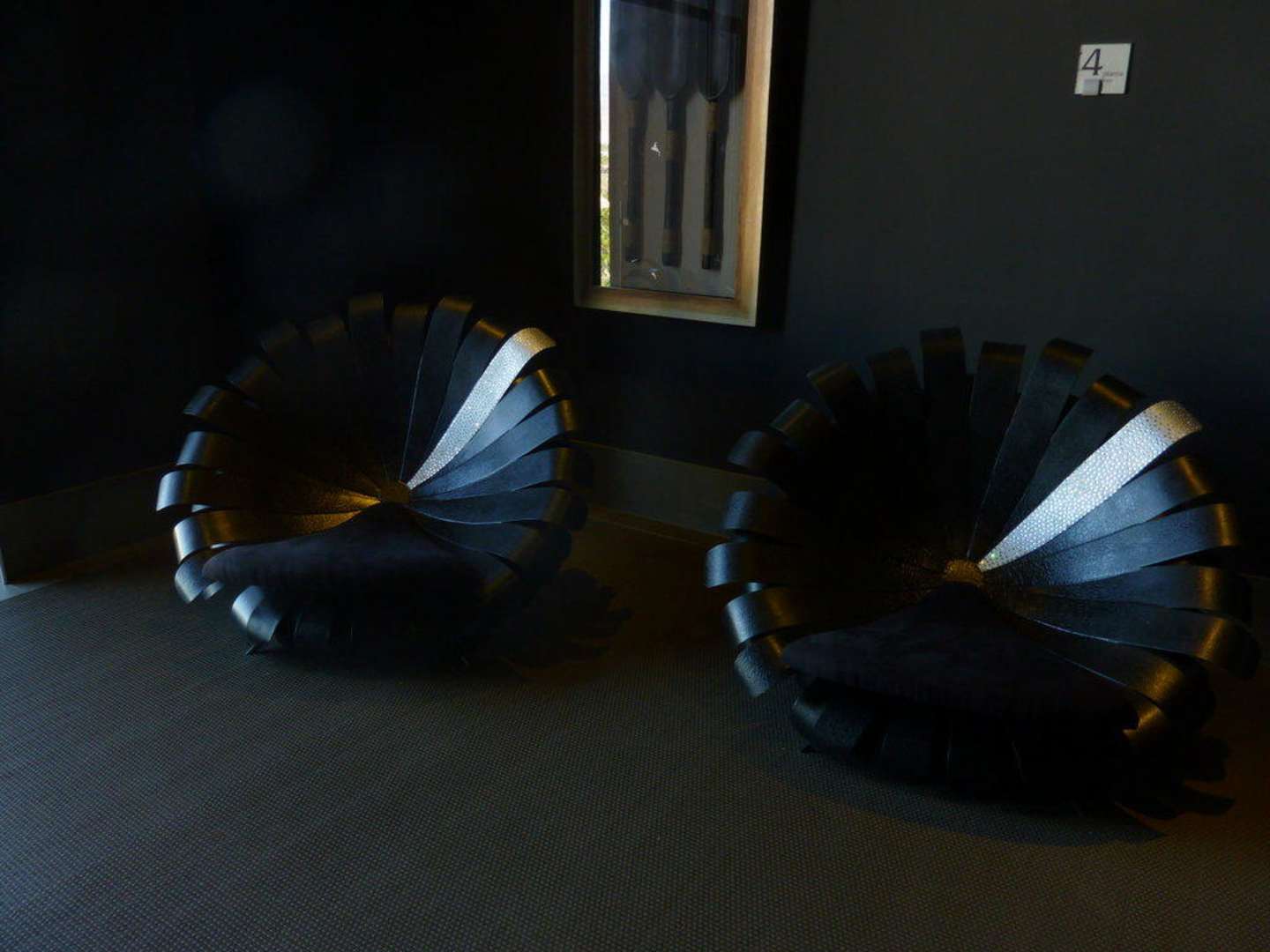 diese stilvollen Sitzgelegenheiten befinden sich direkt vor den Aufzügen
