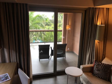 Teilüberdachter Balkon mit sehr schöner Aussicht. Zimmer: Doppelbett mit Garten-/Poolblick