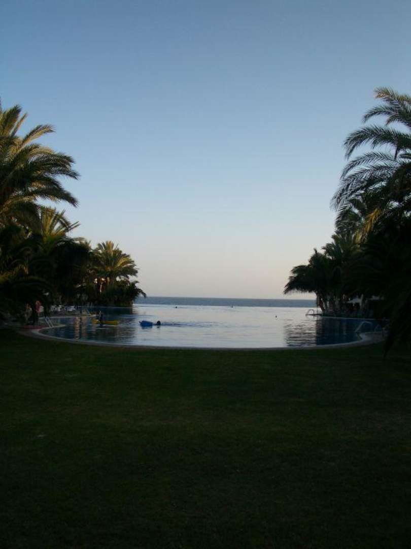Kurz vor Sonnenuntergang am Großen Hotelpool mit Blick aufs Meer