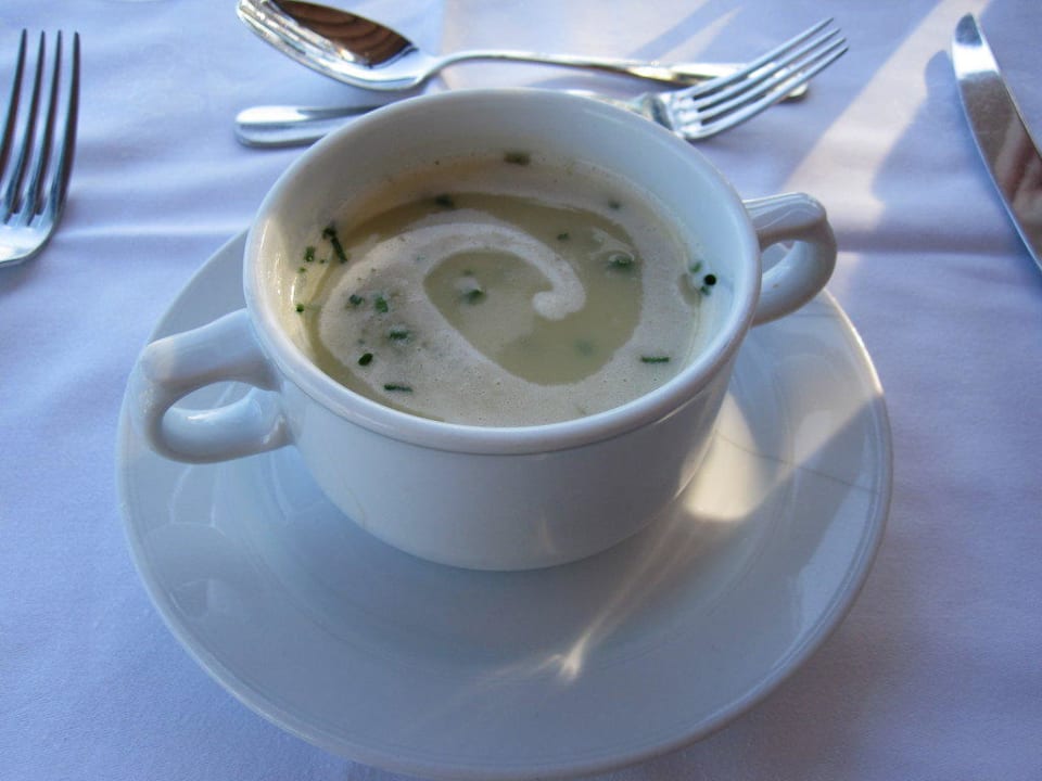 Zucchini-Cremesuppe mit Tempura von Tintenfischen und Krabben