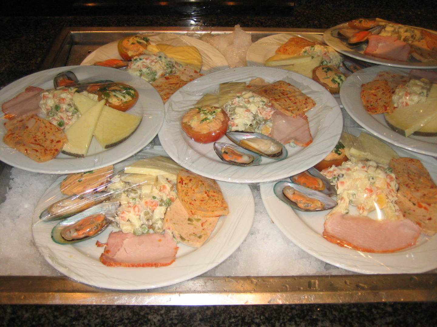 Einige der bereitgestellten schon fertigen Frühstücksteller zum nehmen.