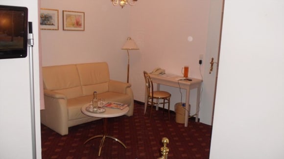 Im Zimmer 5 - Hochtiedsstuv Sitzeckenbereich mit bequemen Ledersofa links erkennbar der um die Ecke schwenkbare Flachbildfernseher