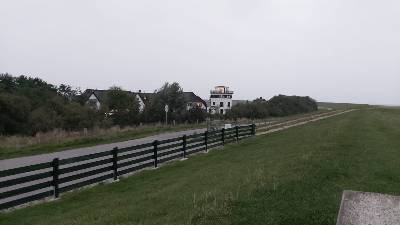 Das Hotel samt Leuchtturmspa vom Deich aus
