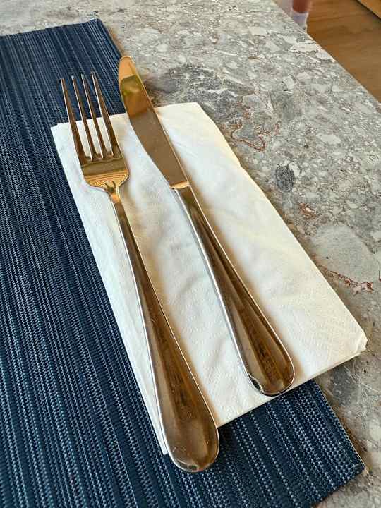 Besteck auf Papierserviette lieblos abgelegt – wirkt eher wie Imbiss statt gehobenes Resort.