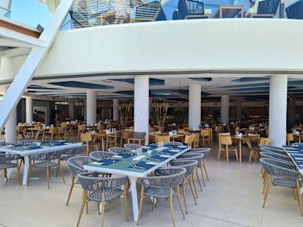 Blick von der Außenterrasse in den Speisesaal, darüber die Lobby-Bar