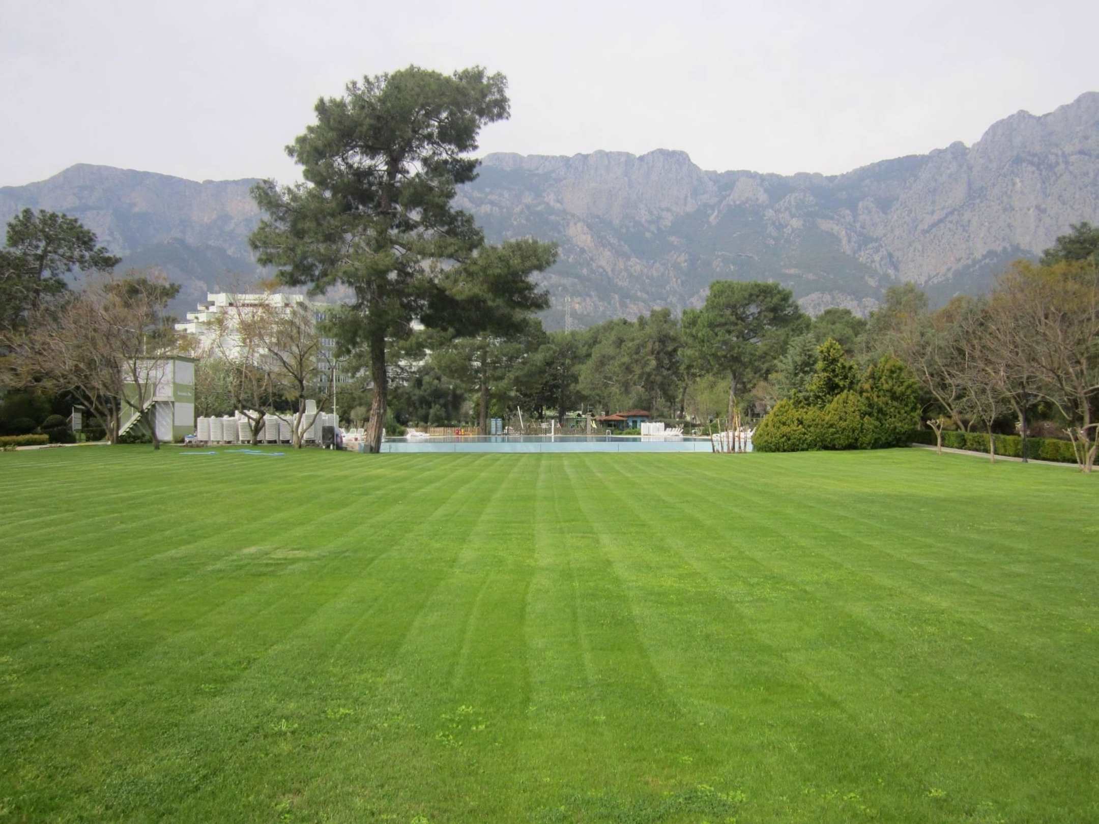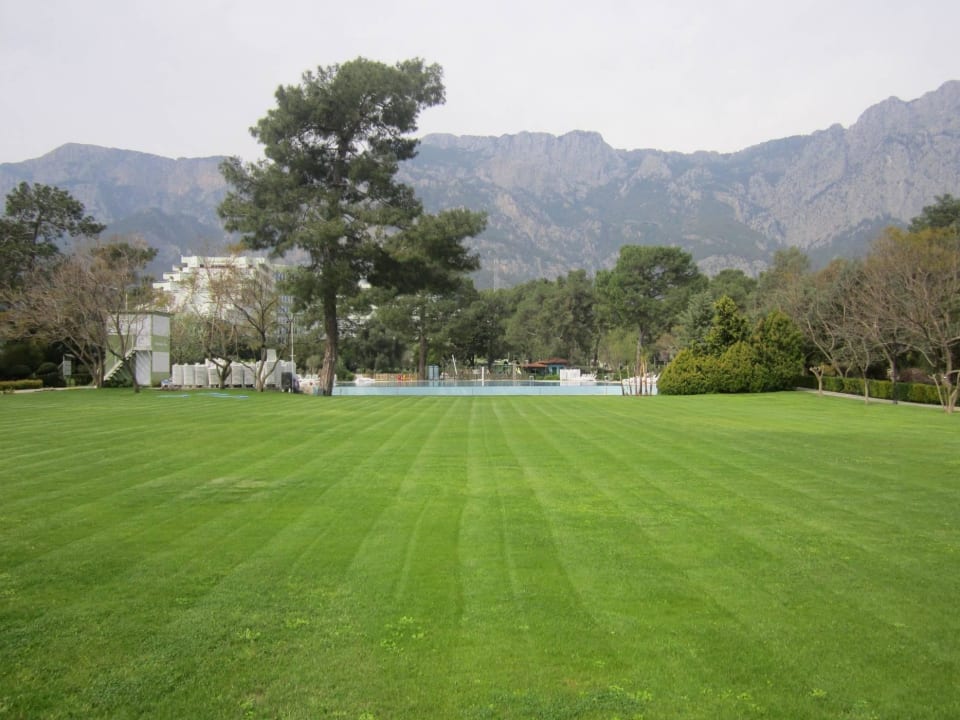 Große gepflegte Liegewiese zwischen Pool und Strand
