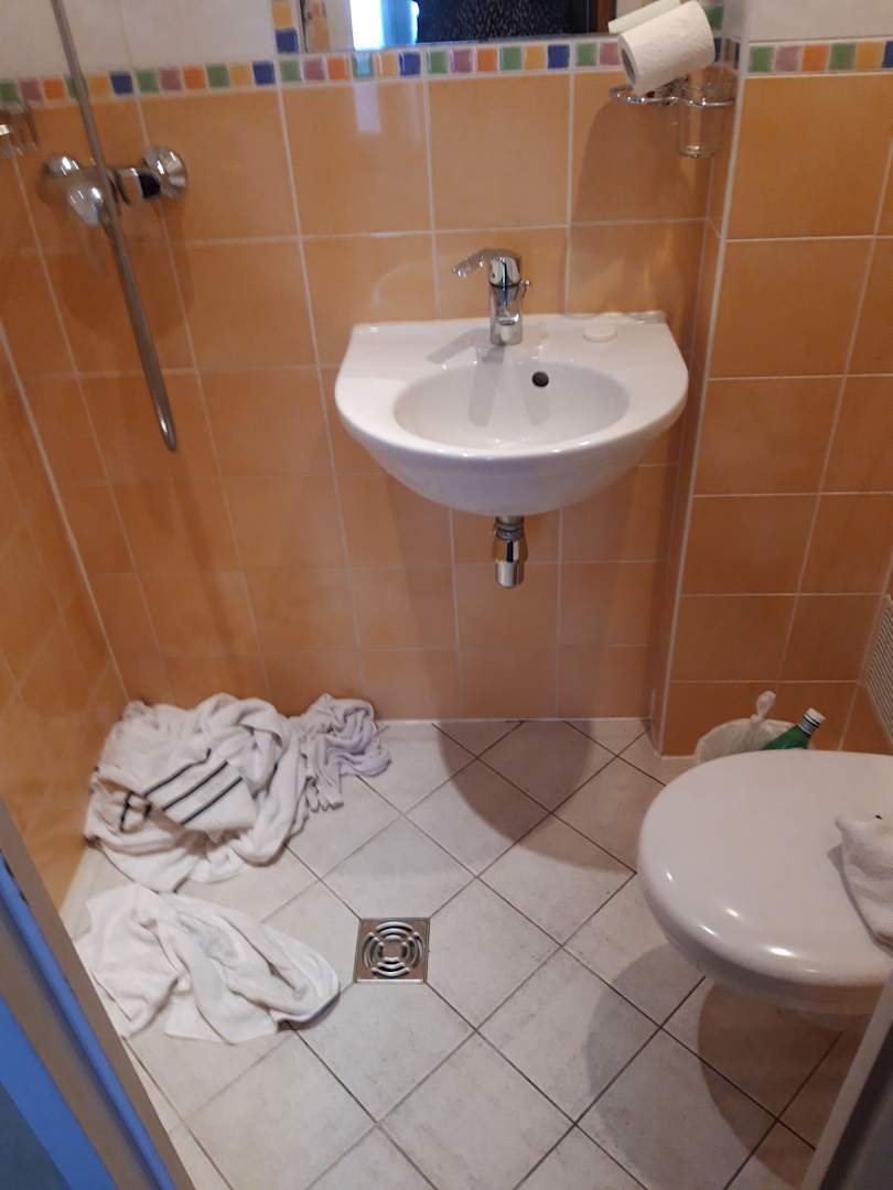 ZimmerBadezimmer, ohne Lüftung, kein Licht über dem Waschbecken, kein Föhn, Dusche nicht abgetrennt