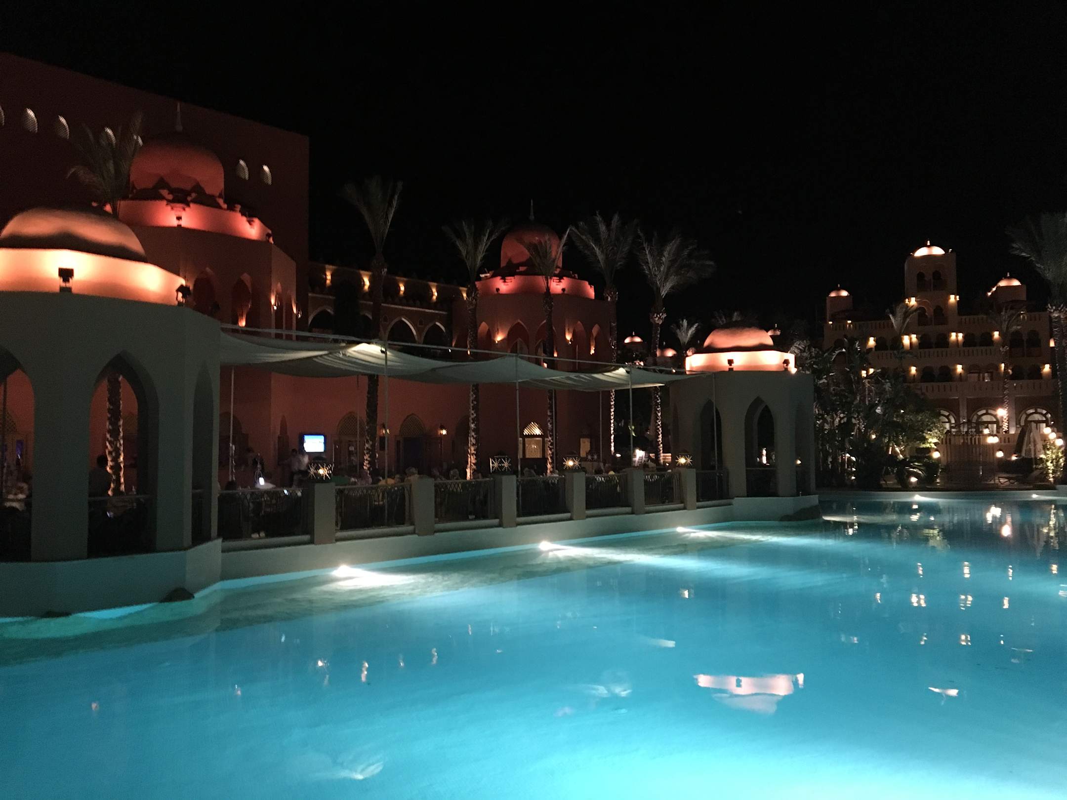Jokerbar und Pool bei Nacht