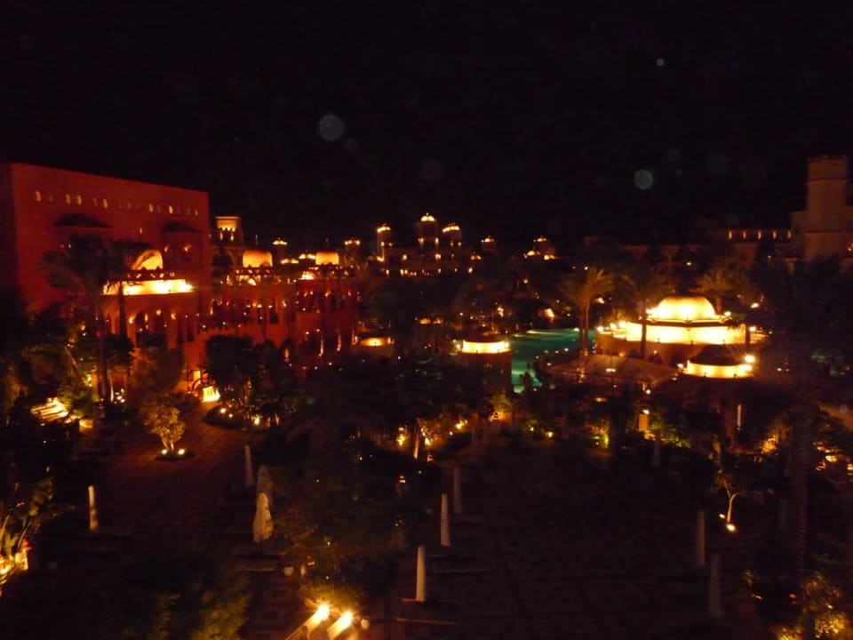 die ansicht der Pool und Gartenanlage bei Nacht.