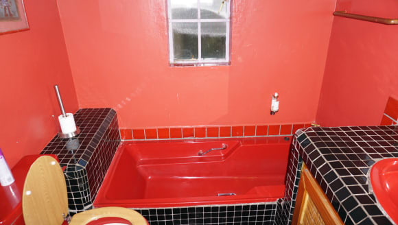 Die rote Wanne mit transparentem Fenster nach draußen.