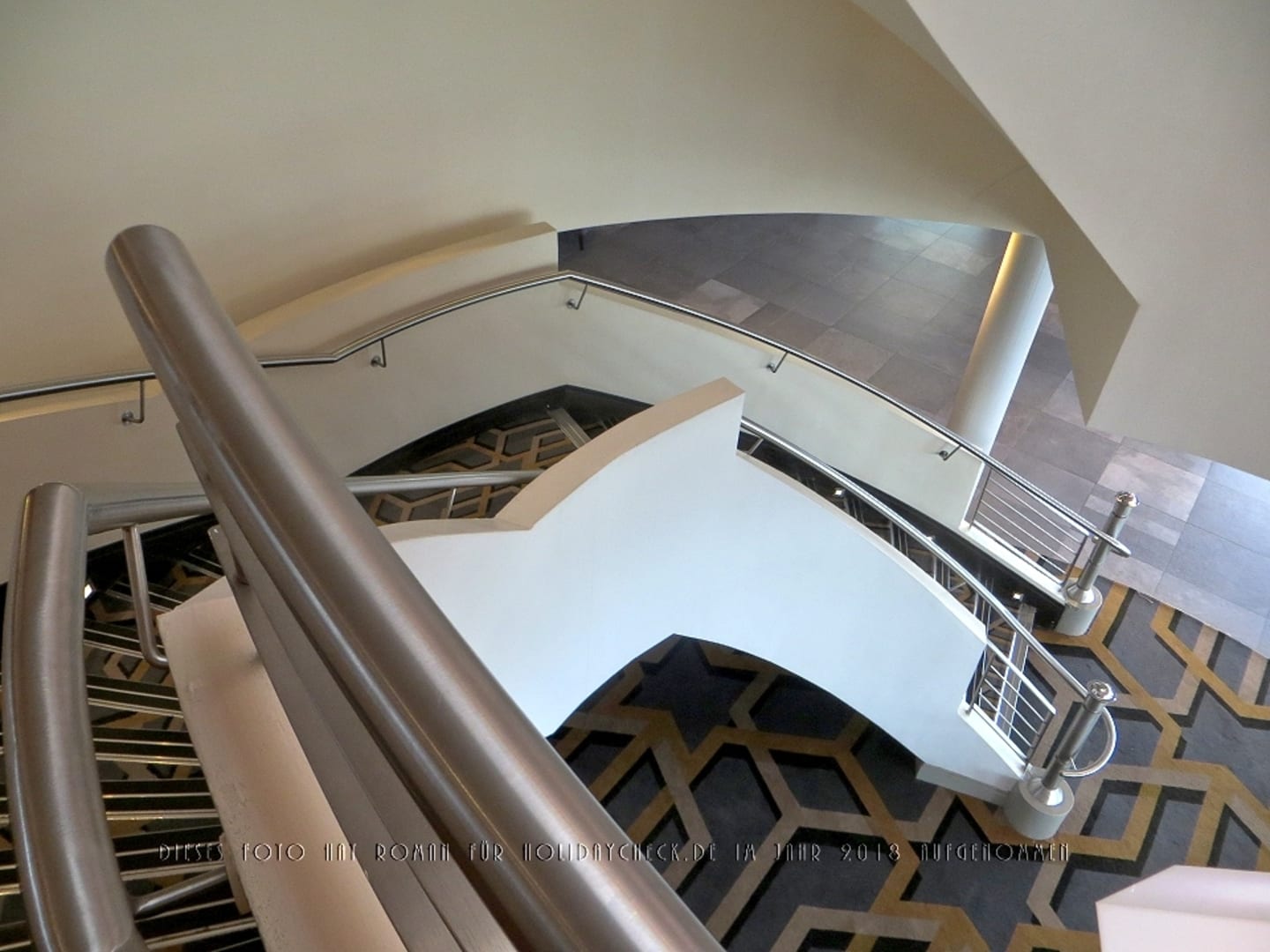 Blick vom ersten Obergeschoss die Treppe hinab zur Lobby.