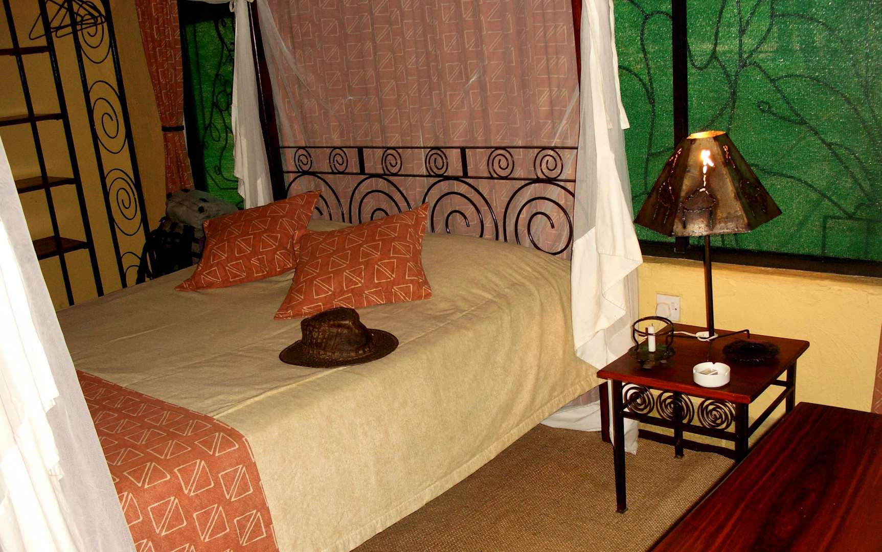 Innenansicht eines Chalets komfortable Ausstattung, Seitenwände zeltartig, Front- und Rückseite gemauert, im Anbau Bad elektrisches Licht, Fan
