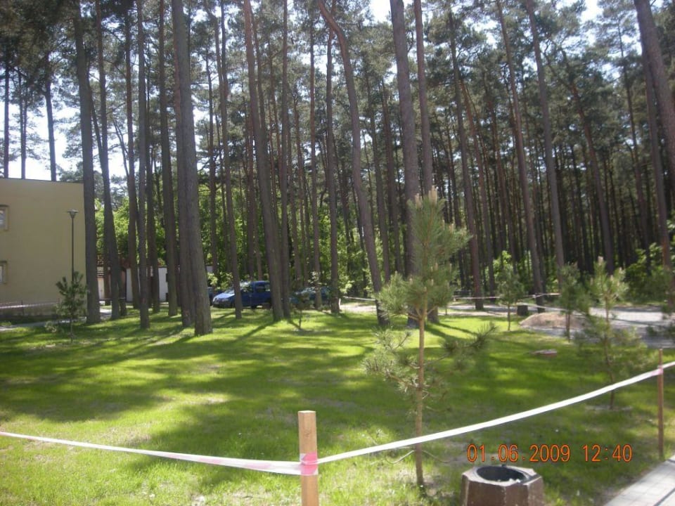 dużo zieleni a tyłu widoczny parking