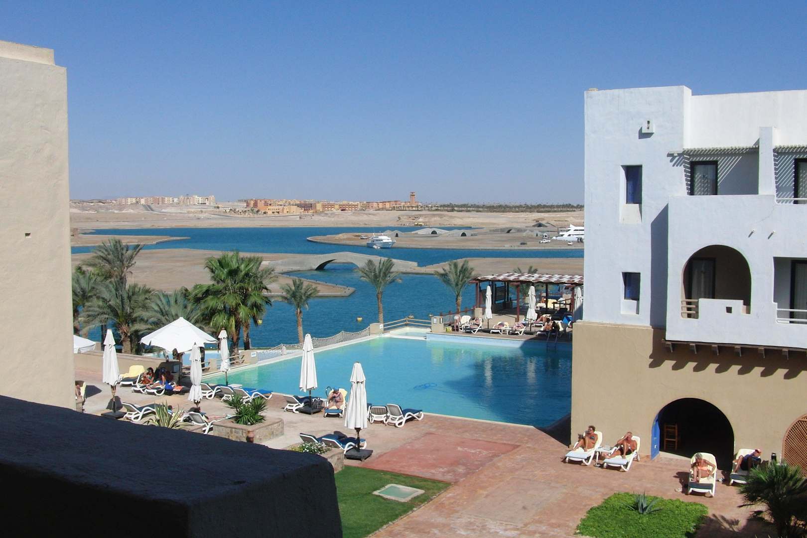 Ausblick vom Zimmerbalkon links (Pool und Kanal)