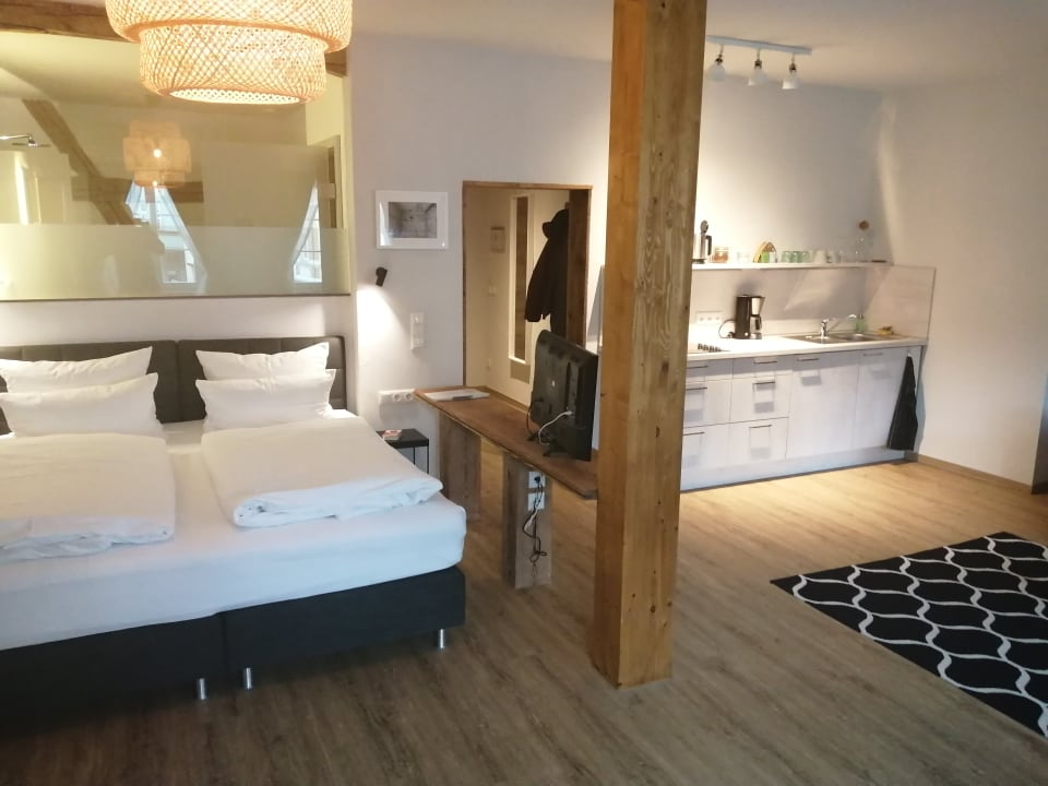 Apartment : Doppelbett und Küchenzeile