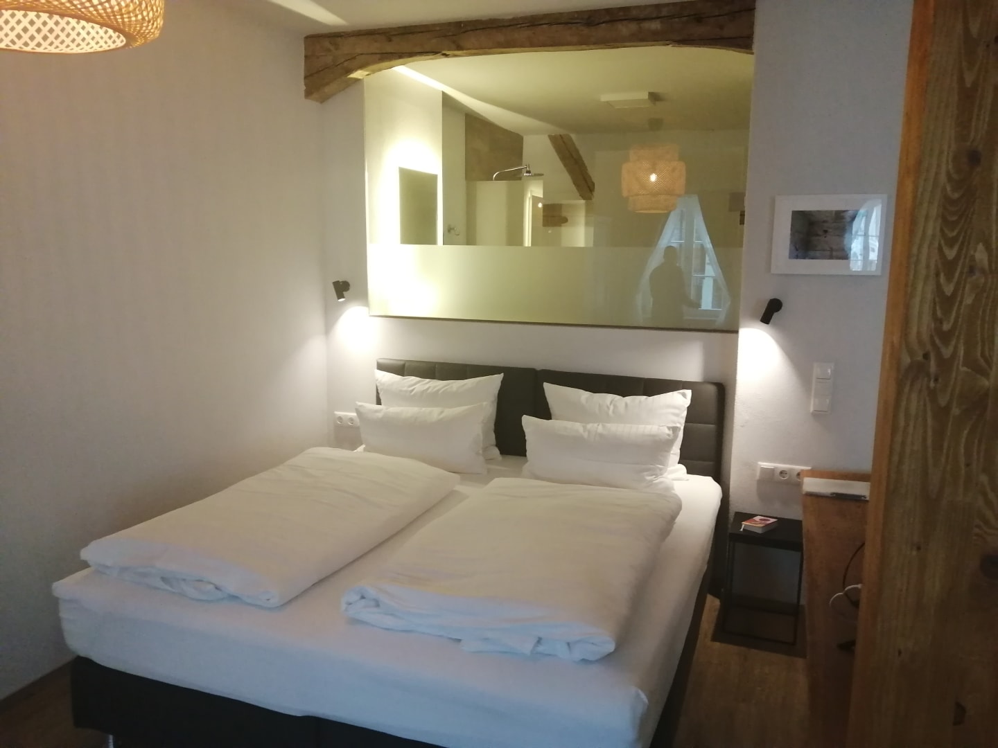 Apartment : Doppelbett, dahinter die Glasfront zum Bad