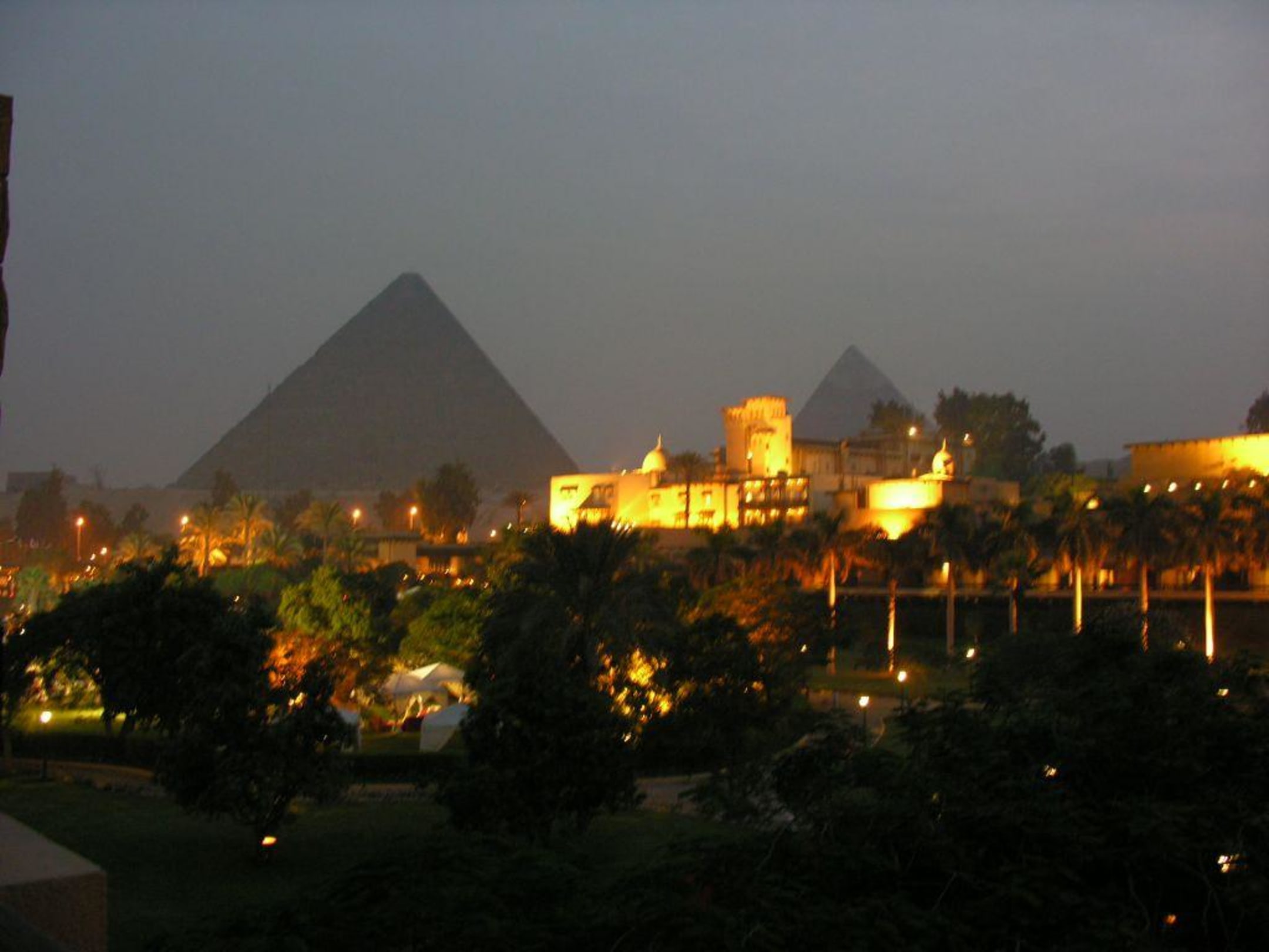 Abendblick vom Balkon auf die PyramidenEs wurde langsam aber stetig dunkel und das Mena House erleuchtete in seinen prächtigen Strahlen