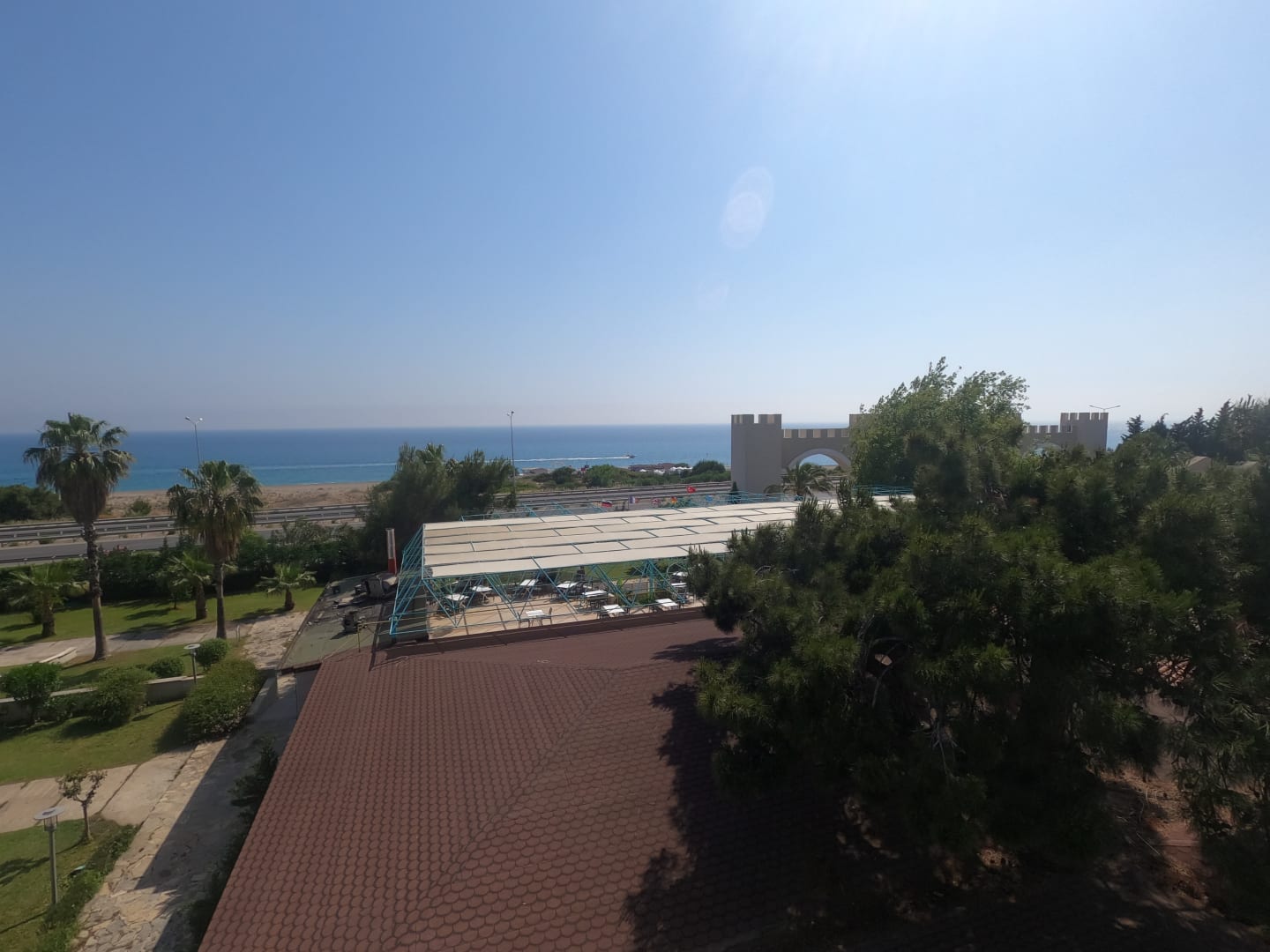 Blick von der Rutschenanlage in Richtung Meer bei Mittagssonne