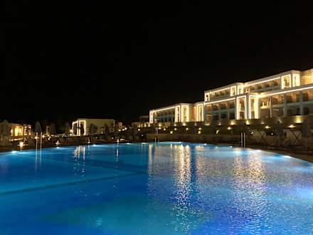 Hauptpool und Hotel am Abend