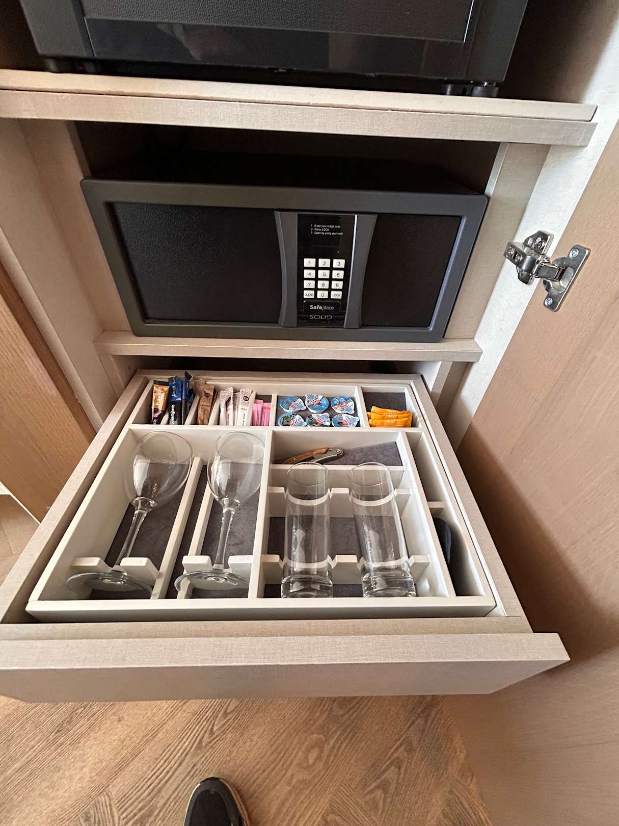 ZimmerTresor ohne Gebühr, in der Schublade die Gläser und Kaffee, Weinflaschenöffner.