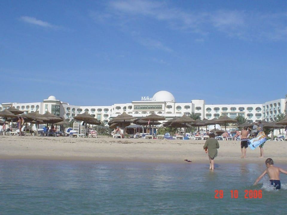 Blick vom Meer aufs Hotel und Hoteleigenen Strandabschnitt