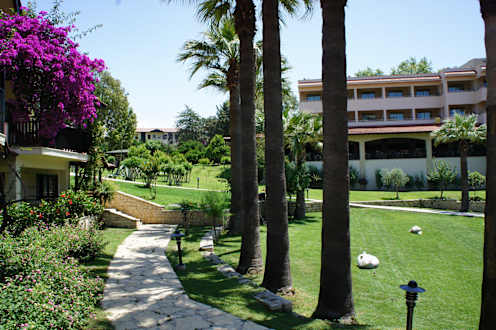 Gartenanlage mit Blick auf das Hauptrestaurant