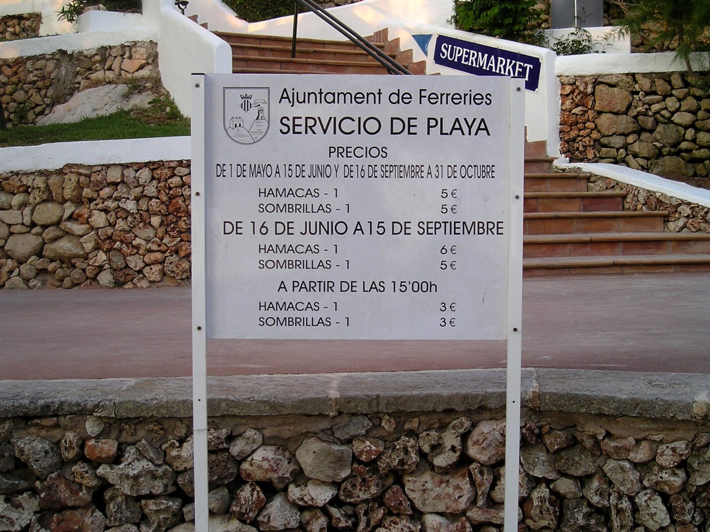 Die Preisliste steht direkt beim Hotel am Strand. Die Preise gelten für die gesamte Cala Galdana Bucht Stand 05.2012