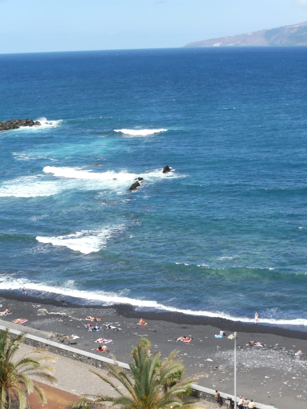 Blick auf den schwarzen Strand vor dem Hotel