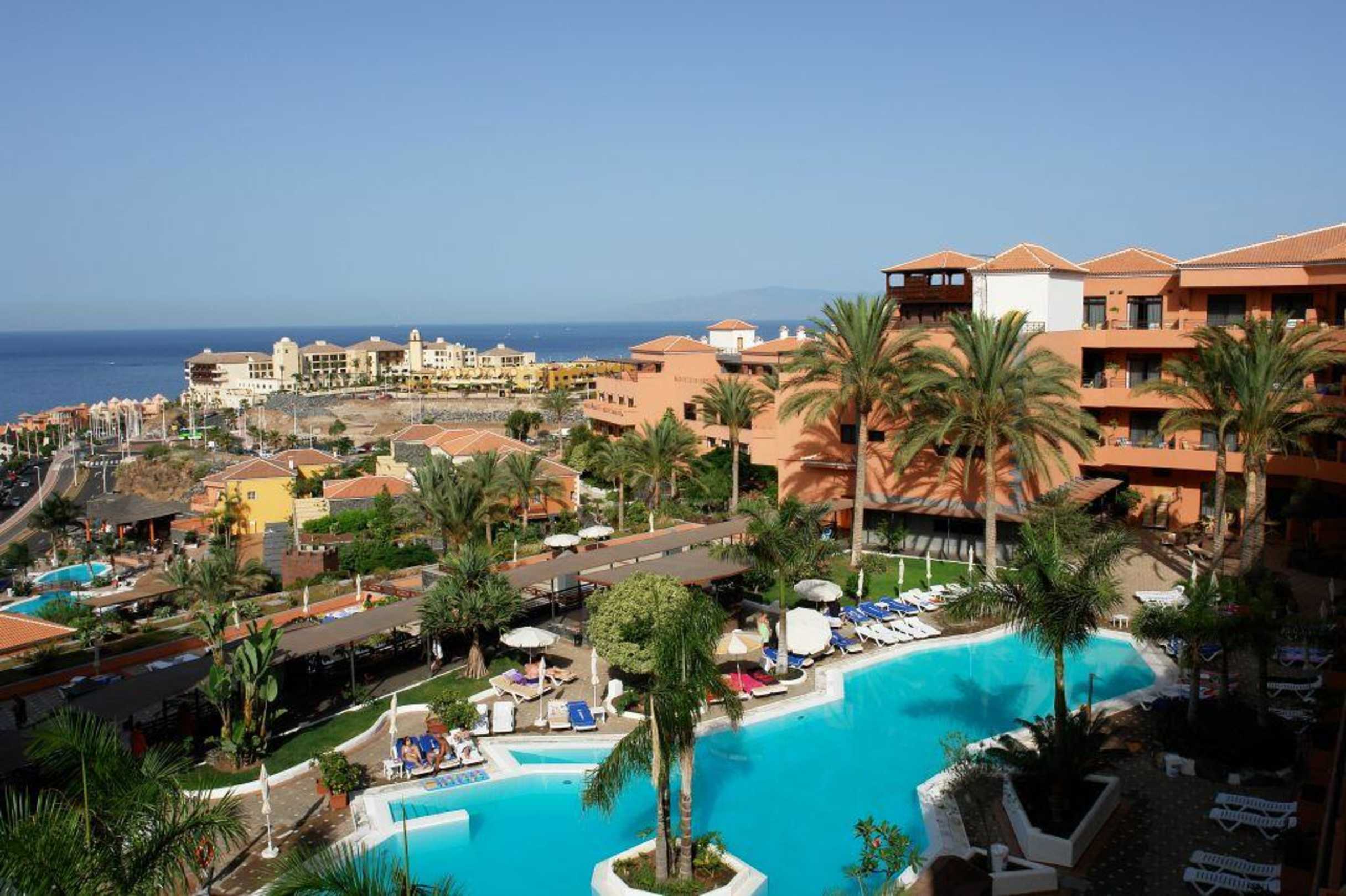 Kleiner HotelpoolBlick auf die Gartenanlage und einen von 2 Pools des 4 Sterne Hotels. Im Hintergrund der Atlantik mit Nachbarinsel La Gomera.