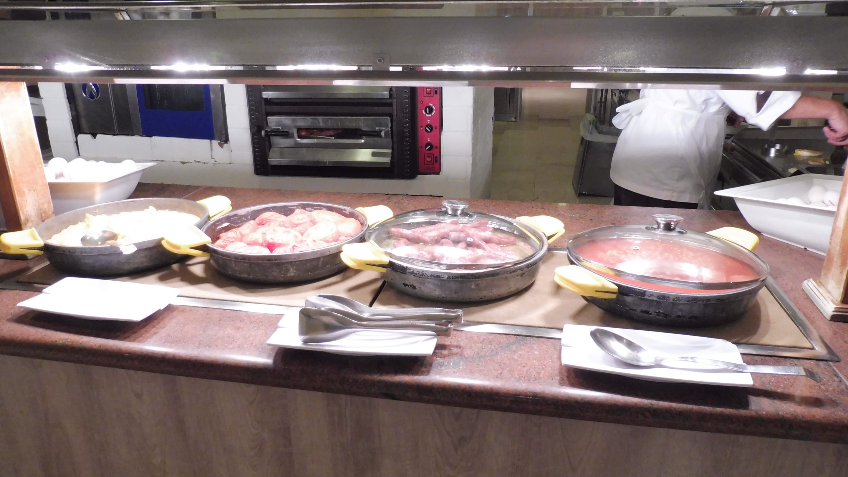Teil des Frühstücksbüffet (Ei, Tomaten, Würstchen, Bohnen)