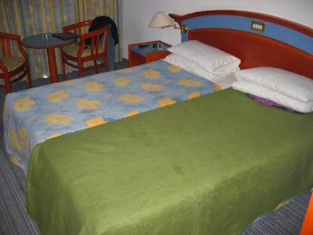 Bettanlage des Zimmers 224 mit Decken und Zusatzkissen (im Schrank).
