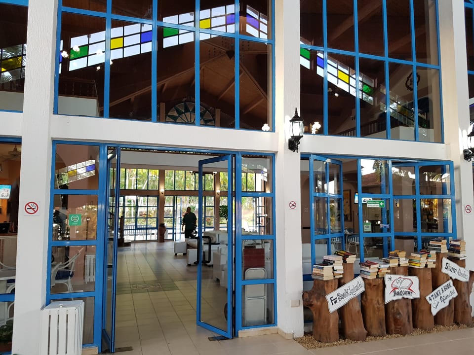 LobbyBücher gibt es genügend, falls Ihr Eure vergessen habt. im Hintergrund die Haupthalle. Rezeption links, Bar rechts.
