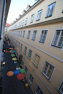 Blick aus dem Zimmerfenster in die Gasse, über die man das Hotel erreicht