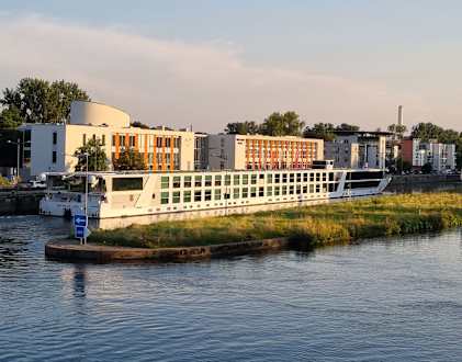 Blick von der Maxbrücke zum Hotel. Davor wartet ein Kreuzfahrtschiff auf die Schleuse.