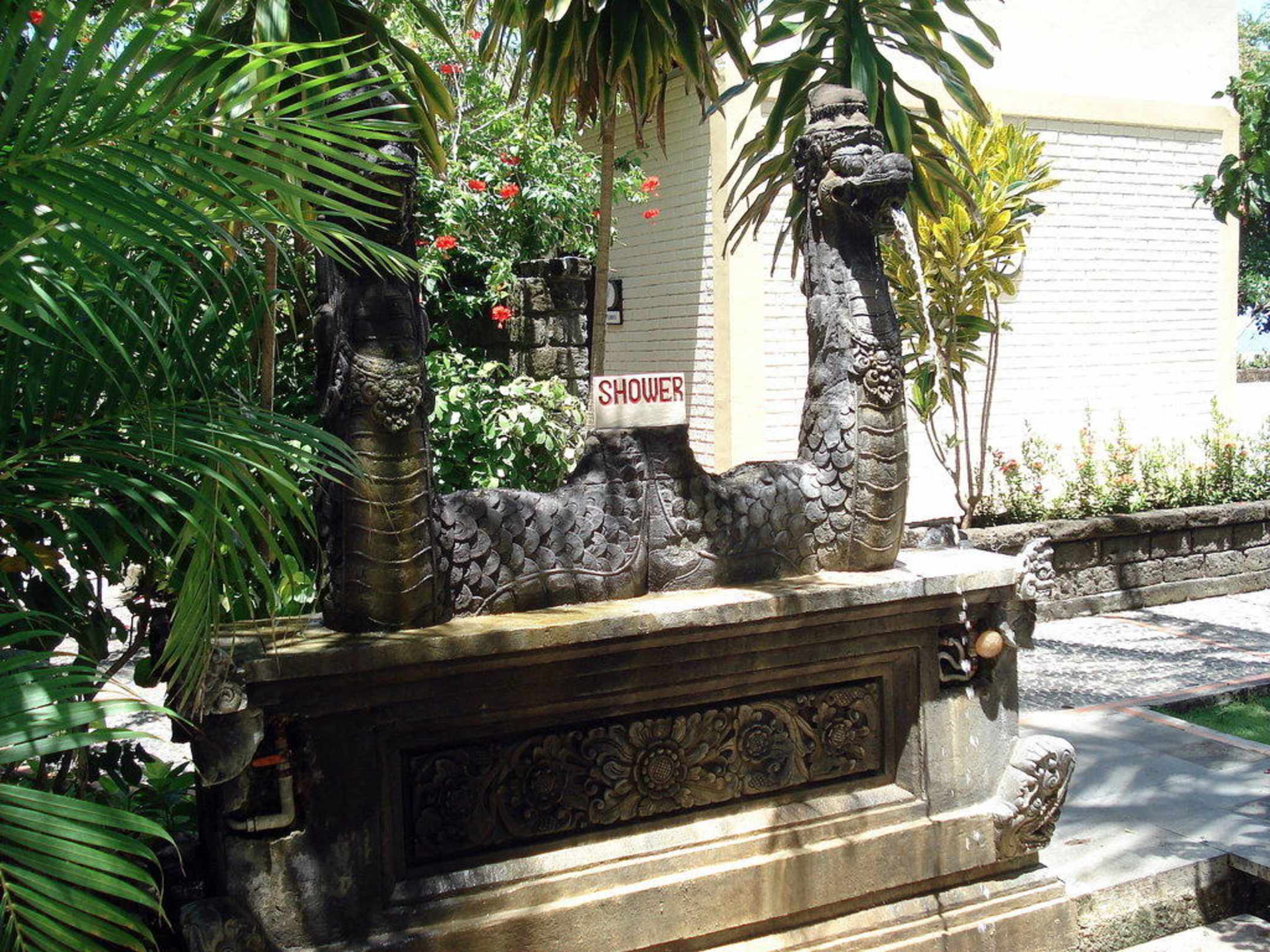 hier ist die Dusche am großen Pool zu sehen - in Form eines balinesischen Dämons!
