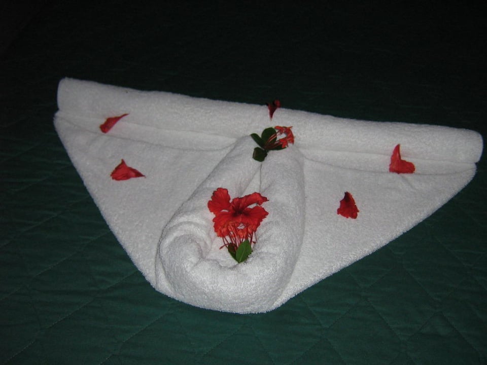 Handtuchfigur bei Ankunft im HotelWir fanden während unseres gesamen Urlaubs immer neue Figuren auf unserem Bett vor.