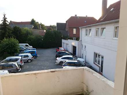 Kleiner Balkon mit Sicht auf den Parkplatz