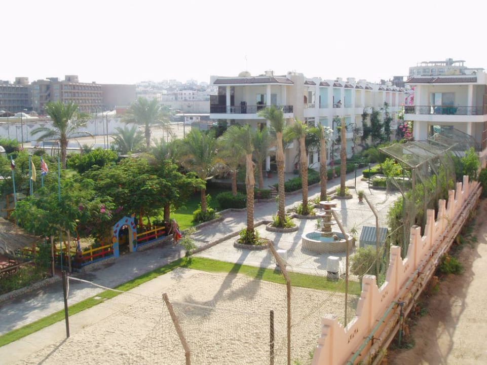 Blick von obenvorn das Volleyballfeld, gegenüber, das Bunte, ist der Spielplatz und rechts hinten beginnen die Zimmer