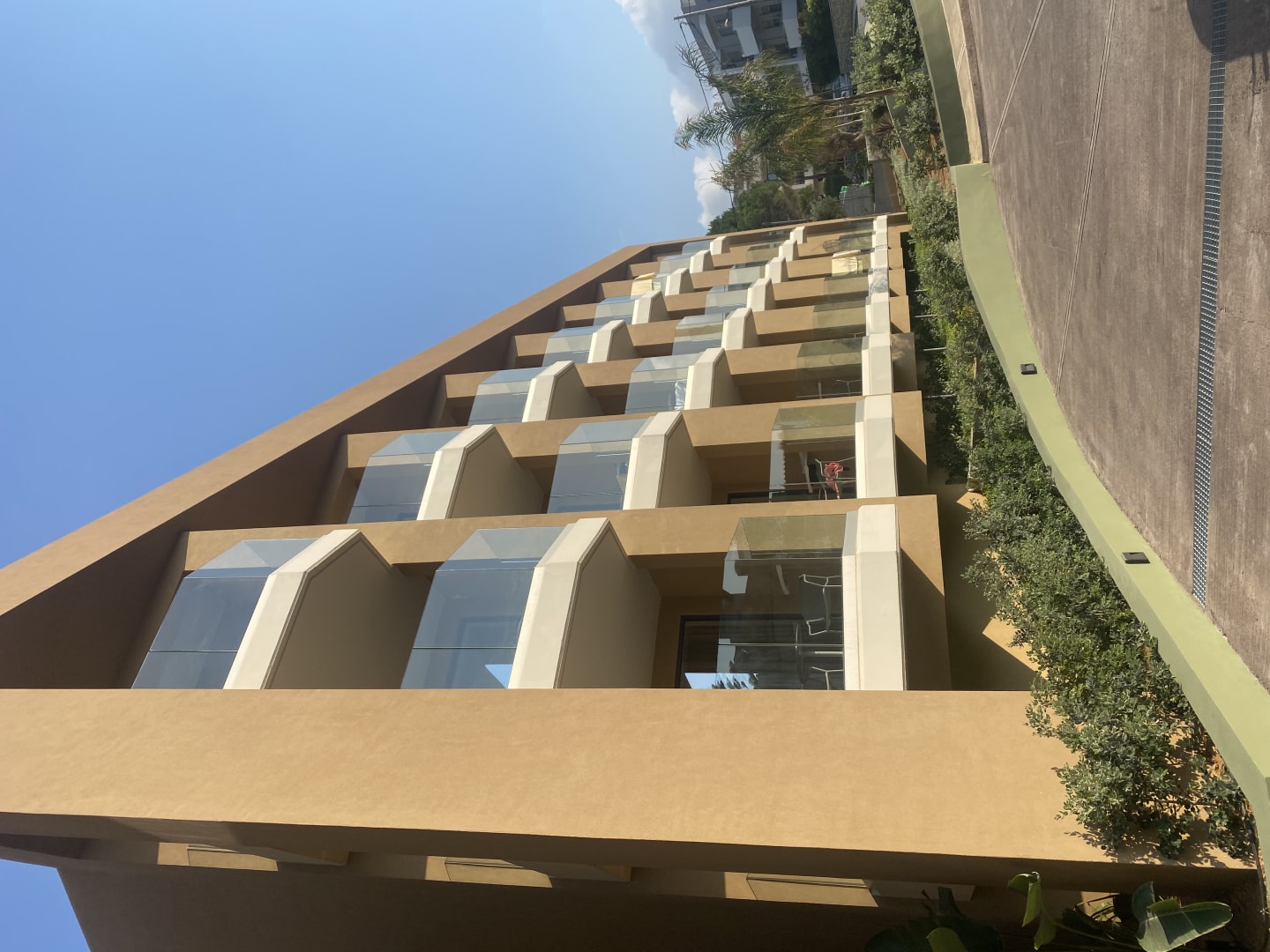 Eine Seite der Fassade mit den Hotelzimmern mit Balkon.