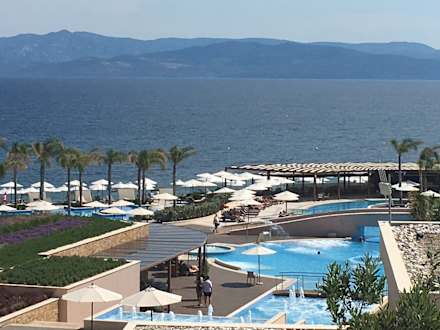 Außblick vom Restaurant aufs Meer und Poolanlage