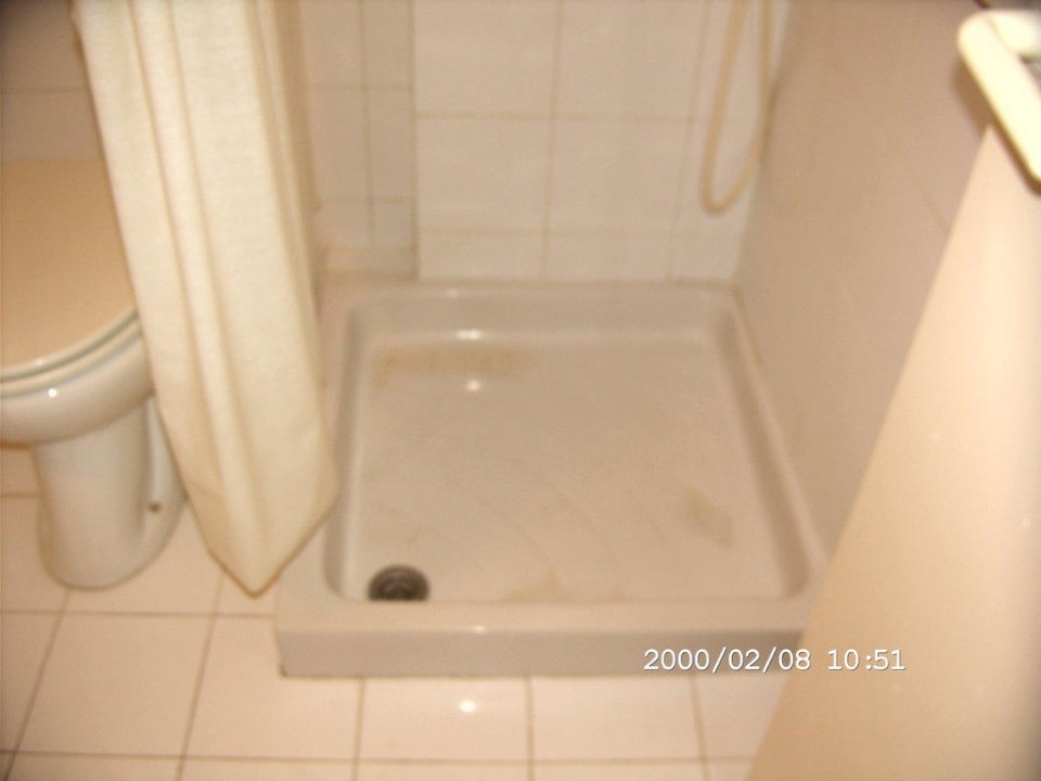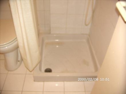 Duschwannedreckige und viel zu niedrige Duschwanne beim Duschen wurde das Badezimmer überschwemmt