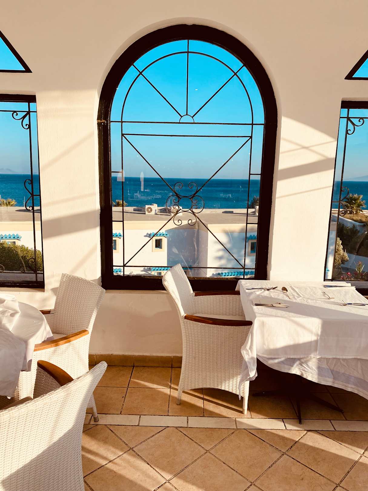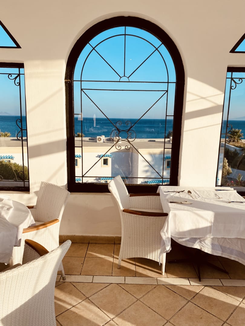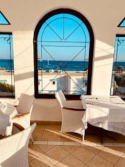 Speisesaal mit Ausßenterasse mit Blick auf's Meer