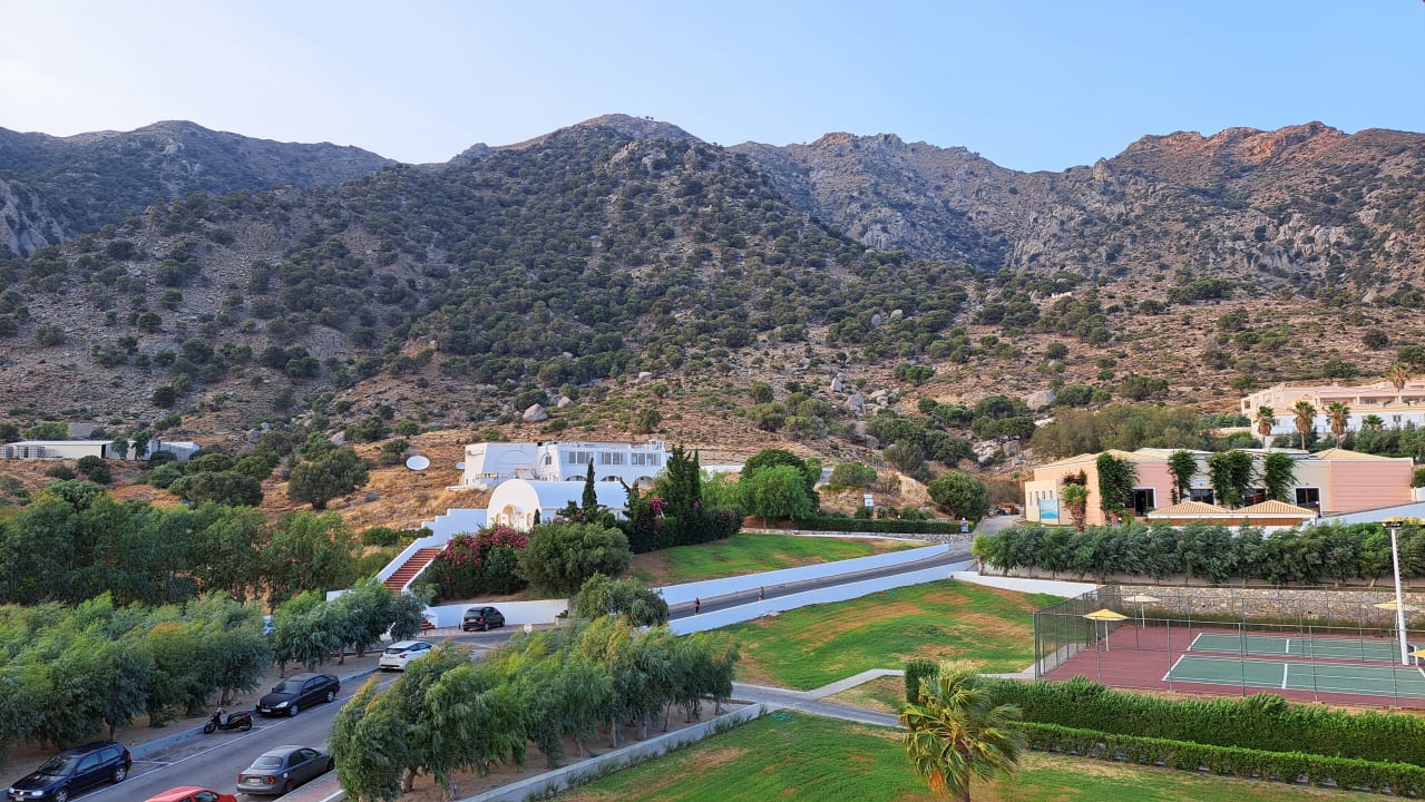 Blick nach rückwärts zum Tennisplatz und zum Gebirge hinter dem Hotel