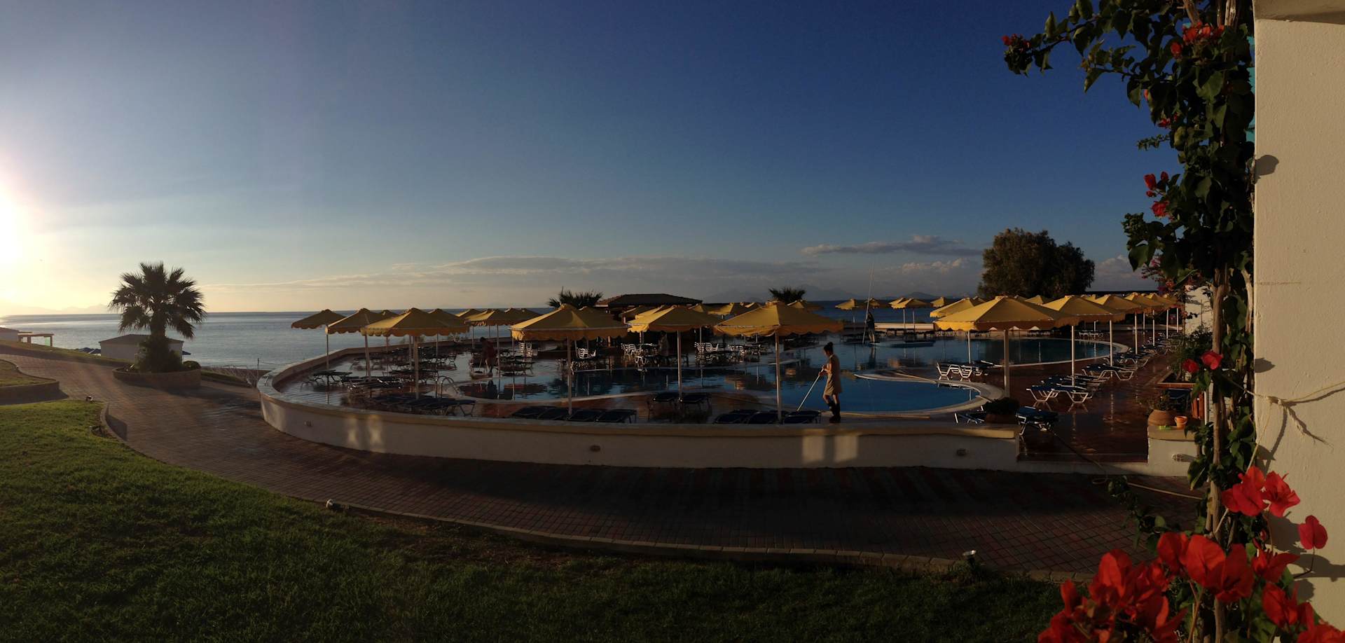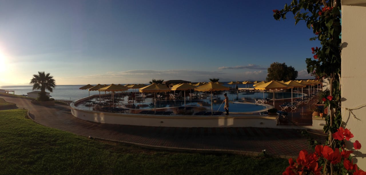 Widok z pokoju na mniejszy basen oraz Morze