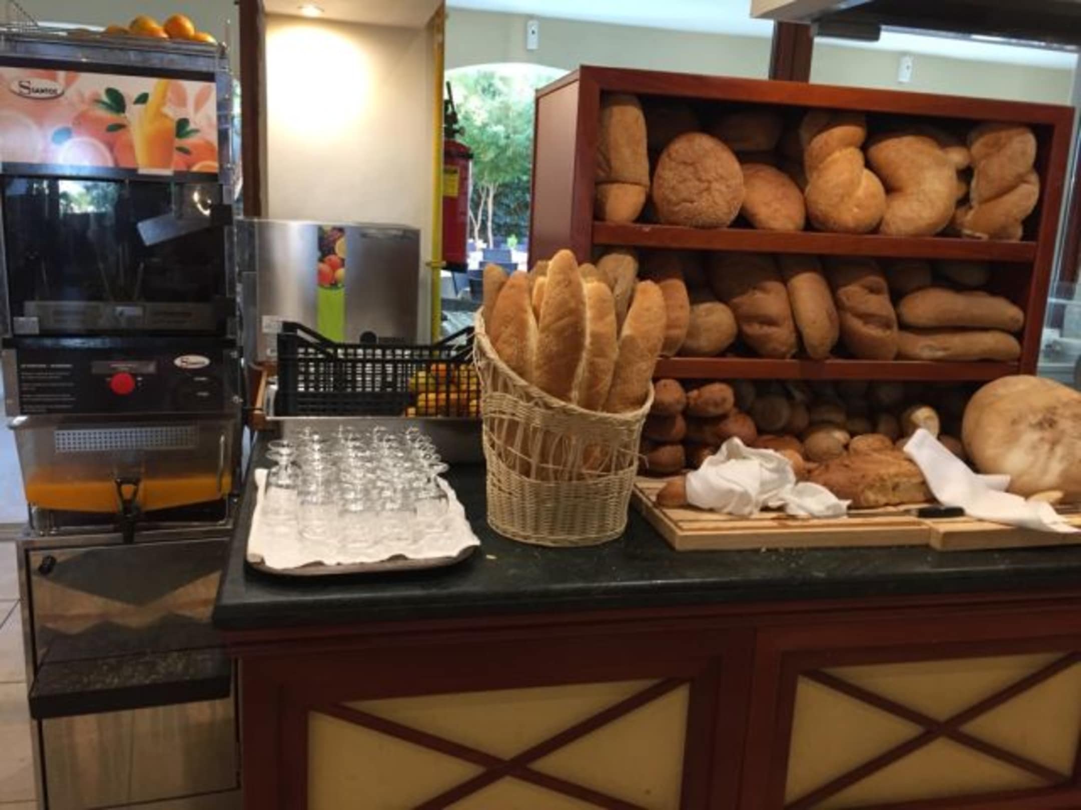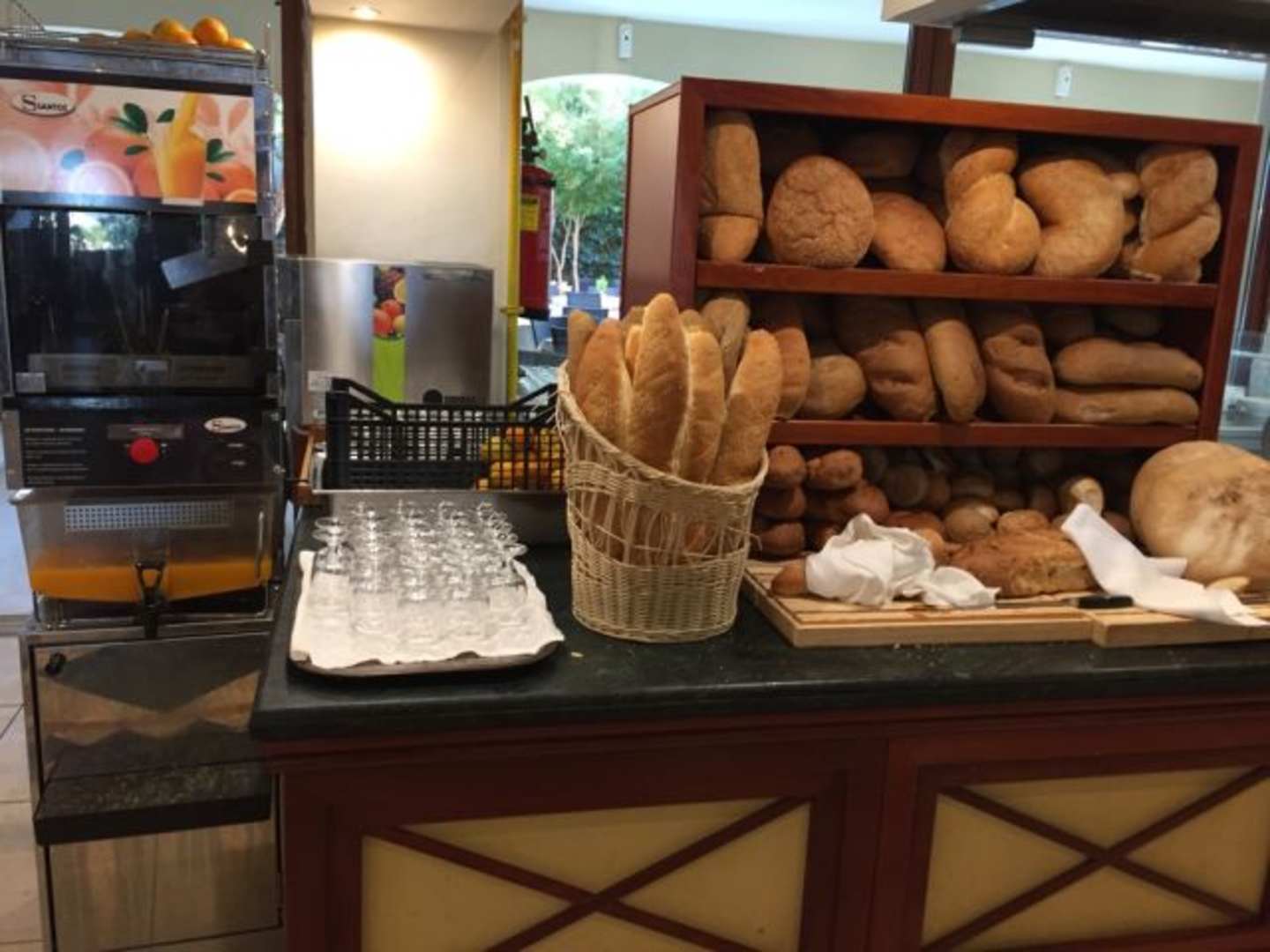 Brot und Brötchenauswahl und links der Automat mit dem frisch gepressten Orangensaft